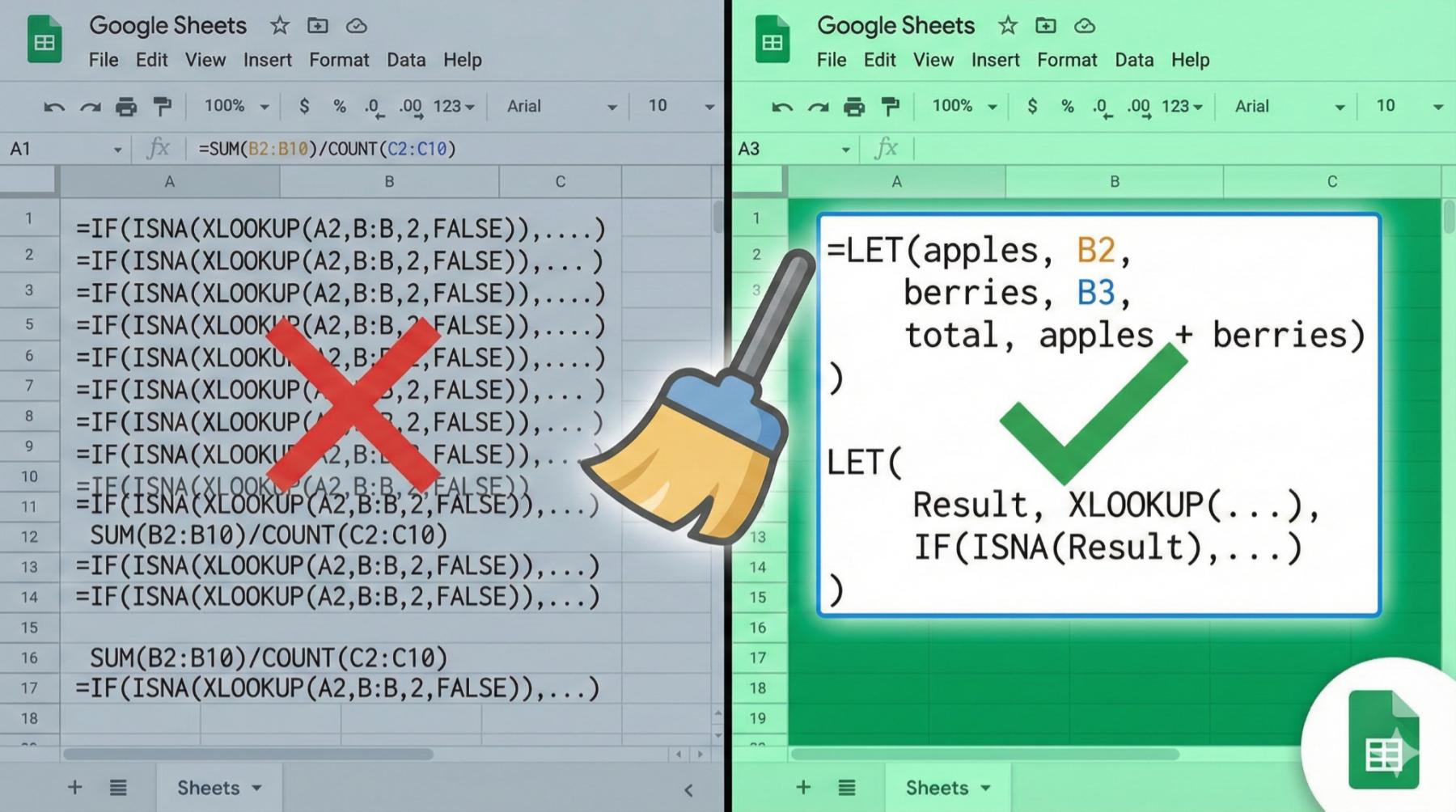 Google Sheets ནང་གི་ LET བྱེད་ལས་ (Function) བཀོལ་ནས་རྙོག་འཛིང་ཅན་གྱི་རྩིས་གཞི་ (Formulas) དག་ཇི་ལྟར་སྟབས་བདེ་རུ་གཏོང་ཐུབ་མིན་སྐོར་གྱི་ལམ་སྟོན་ཞིག་ཡིན།